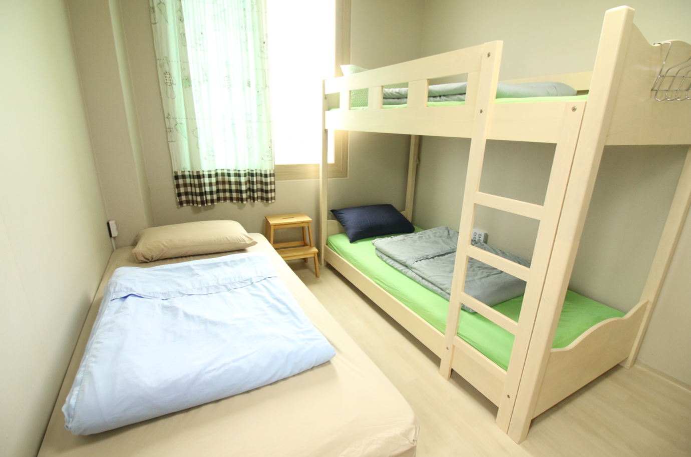 완도네시아 게스트하우스 503호는 싱글침대와 이층침대가 있는 3인 객실입니다.